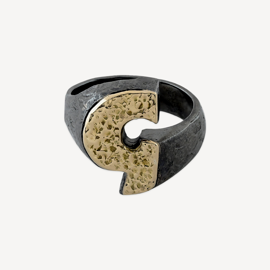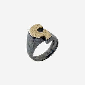 ANELLO “MONOGRAMMA” ORO GIALLO E ARGENTO BRUNITO CON CARATTERI A STAMPATELLO